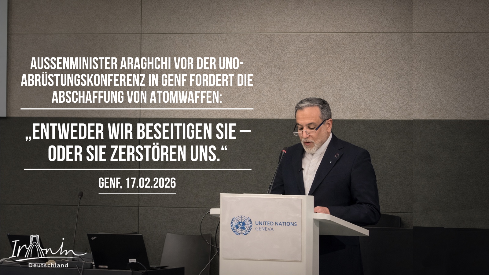 Außenminister Araghchi forderte die derzeitige Blockade der Abrüstungskonferenz zu überwinden und Verhandlungen über eine umfassende Konvention zum Verbot von Kernwaffen aufzunehmen. „Entweder wir beseitigen die Atomwaffen – oder eines Tages werden sie uns vernichten“ betonte er.