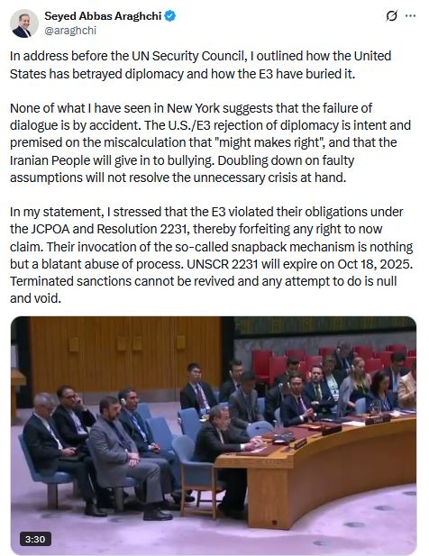 Außenminister Araghchi beim Sicherheitsrat der Vereinten Nationen am Rande der Uno-Generalversammlung in New York auf der Plattform X: Nichts von dem was ich in New York gesehen habe deutet darauf hin dass das Scheitern des Dialogs ein Zufall ist. Die Ablehnung der Diplomatie durch die USA und die E3 ist beabsichtigt und beruht auf der Fehlannahme dass „Macht Recht schafft“ und dass das iranische Volk Einsch#252chterung nachgeben wird. Ein Festhalten an solchen falschen Annahmen wird die unnötige Krise nicht lösen.